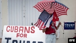 El entonces candidato republicano a la Presidencia de Estados Unidos, Donald Trump (c), habla el 25 de octubre de 2016, durante una visita al Museo de los Combatientes de la Invasión a Bahía de Cochinos, en Miami (Florida).